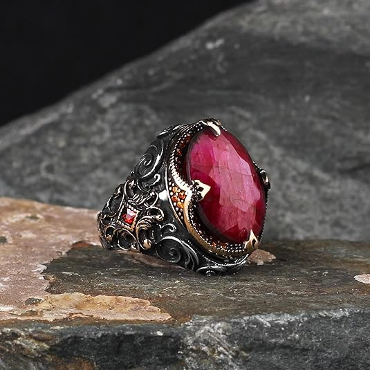 قبل نصف ساعة خاتم رجالي من الفضة الإسترلينية عيار 925 مرصع بأحجار كريمة، مصنوع يدويًا بأحجار كريمة طبيعية - خاتم ياقوت