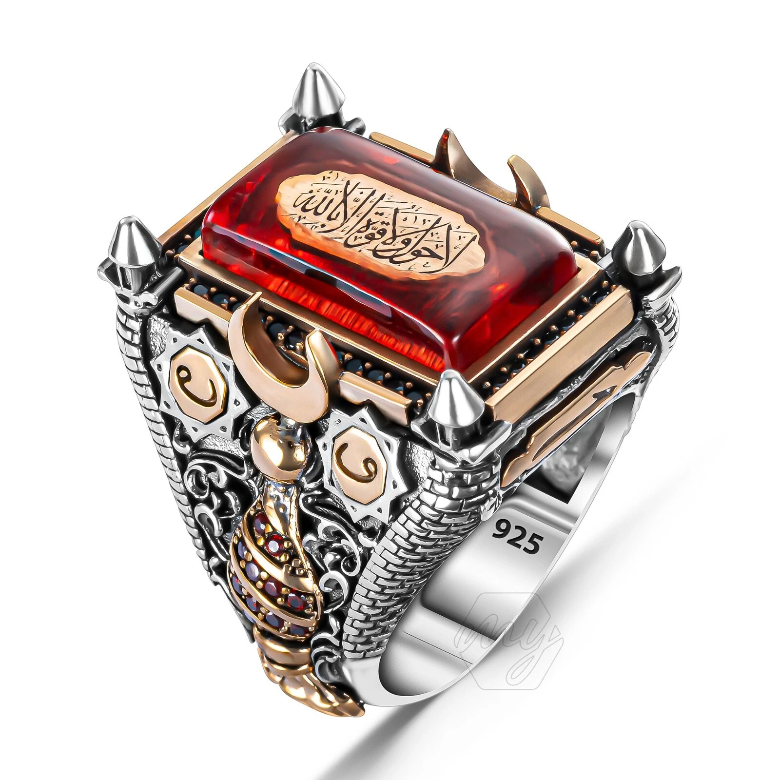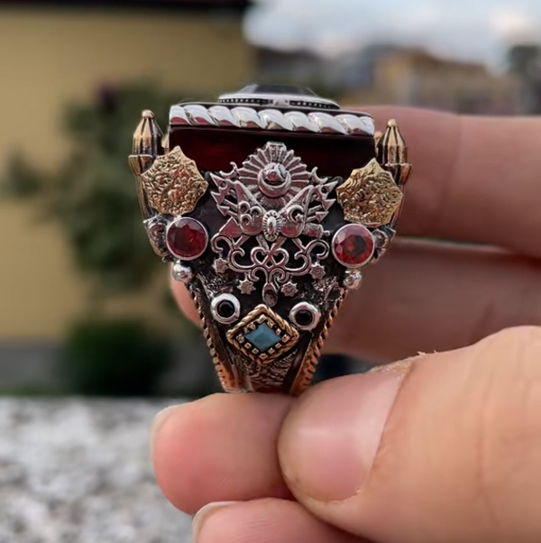 قبل نصف ساعة خاتم رجالي من الفضة الإسترلينية عيار 925 مرصع بأحجار كريمة، مصنوع يدويًا بأحجار كريمة طبيعية - خاتم التاج العثماني